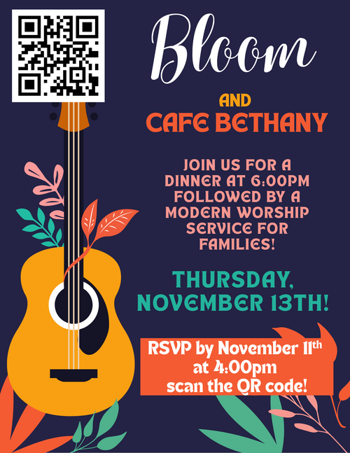 Join us for Bloom and Cafe Bethany one more time before the end of the year! Thursday, November 13th starting at 6:00pm with dinner, and then modern worship for families! This will be a fun time of fellowship together before the holiday season!